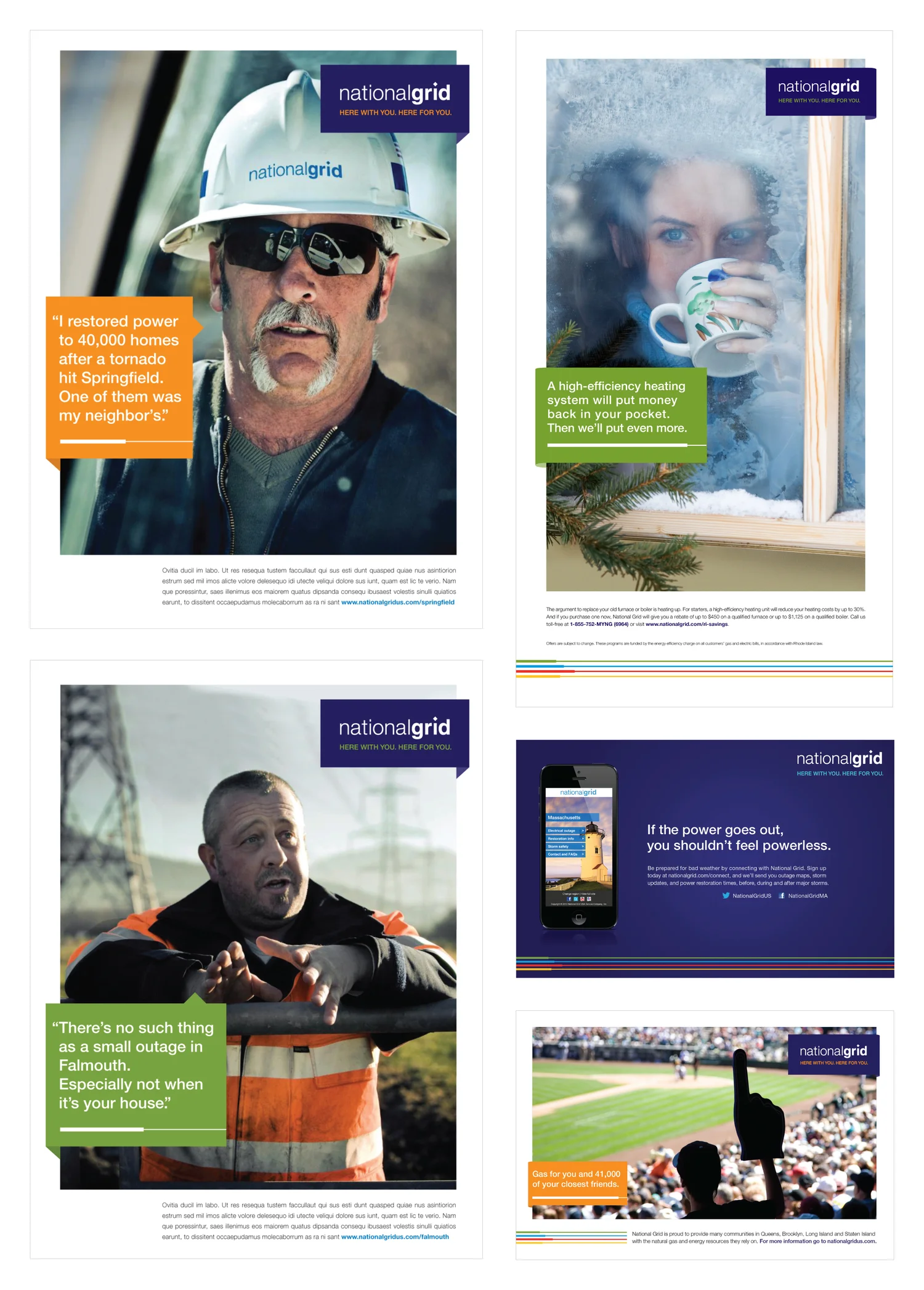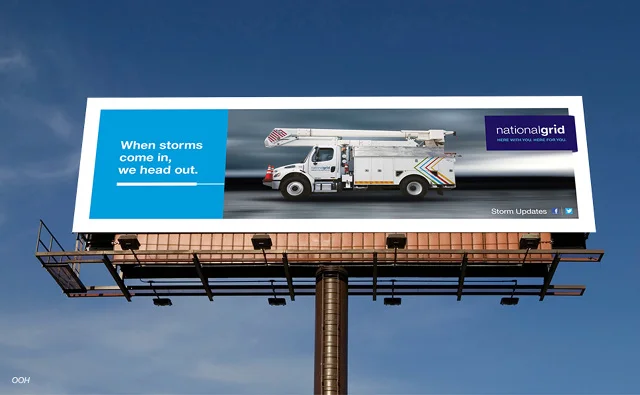 We were asked to help rebrand a giant utility that had just come from the UK and bought up a bunch of individual local power companies in the northeastern United States. The funny thing about National Grid is that they are local at their core–the people out there making sure your lights are on could be your neighbor, your kids' coach, or a person you might be sitting next to at the local coffee shop, because they live in the areas they serve. "Here with you. Here for you." became the rallying cry for the entire company to get behind both internally and externally.