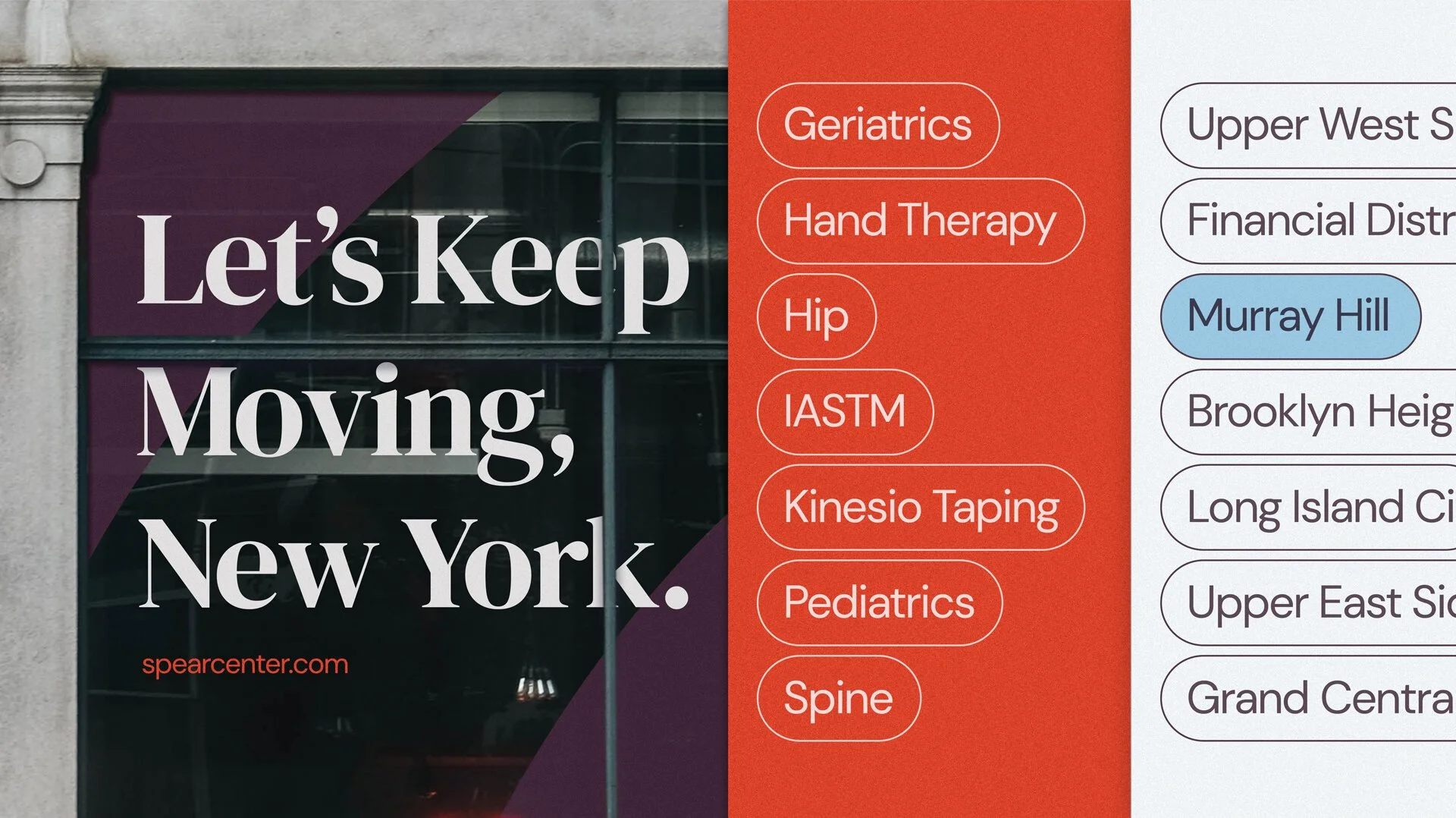 As its largest physical therapy practice, Spear is responsible for keeping New York City moving. We made a campaign to celebrate that movement and speak directly to New Yorkers.